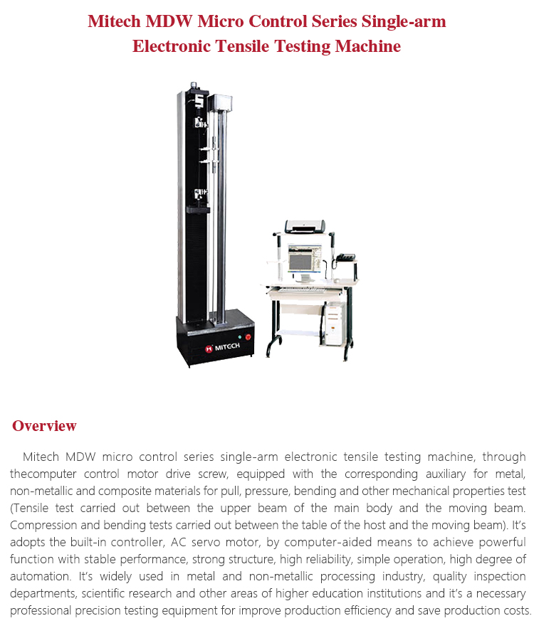 Product OverviewMitech MDW micro control series single-arm electronic tensile testing machine, through the computer control motor drive screw, equipped with the corresponding auxiliary for metal, non-metallic and composite materials for pull, pressure, bending and other mechanical properties test (Tensile test carried out between the upper beam of the main body and the moving beam. Compression and bending tests carried out between the table of the host and the moving beam). It’s adopts the built-in controller, AC servo motor, by computer-aided means to achieve powerful function with stable performance, strong structure, high reliability, simple operation, high degree of automation. It’s widely used in metal and non-metallic processing industry, quality inspection departments, scientific research and other areas of higher education institutions and it’s a necessary professional precision testing equipment for improve production efficiency and save production costs.