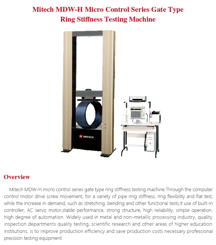 Mitech MDW-H micro control series gate type ring stiffness testing machine.Through the computer control motor drive screw movement, for a variety of pipe ring stiffness, ring flexibility and flat test, while the increase in demand, such as stretching, bending and other functional tests,it use of built-in controller, AC servo motor,stable performance, strong structure, high reliability, simple operation, high degree of automation. Widely used in metal and non-metallic processing industry, quality inspection departments quality testing, scientific research and other areas of higher education institutions, is to improve production efficiency and save production costs necessary professional precision testing equipment.