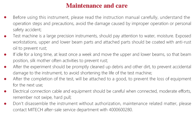 l Test machine is a large precision instruments, should pay attention to water, moisture. Exposed workstations, upper and lower beam parts and attached parts should be coated with anti-rust oil to prevent rust;