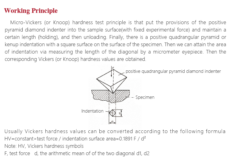 Micro-Vickers (or Knoop) hardness test principle is that put the provisions of the positive pyramid diamond indenter into the sample surface(with fixed experimental force) and maintain a certain length (holding), and then unloading. Finally, there is a positive quadrangular pyramid or kenup indentation with a square surface on the surface of the specimen. Then we can attain the area of indentation via measuring the length of the diagonal by a micrometer eyepiece. Then the corresponding Vickers (or Knoop) hardness values are obtained.