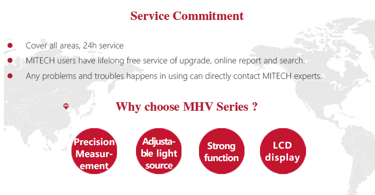 Mitech MHV series vickers hardness tester, based on the principle that positive quadrangular pyramid diamond indenter presses the surface of the sample to produce indentation.By measuring the diagonal length of the indentation to achieve the measurement of the hardness of the material can be for small specimens, thin specimens, surface coating, heat treatment of the workpiece surface Vickers hardness test. With stable performance, strong structure, high reliability, simple operation, adopt high magnification optical measurement system, adjust the cold light source, photoelectric sensing technology and computer-aided means it has a powerful function. It is widely used in the fields of metal processing, electronics industry, mold parts, watch manufacturing, engineering quality inspection and so on. It is an ideal hardness tester for material research and testing.