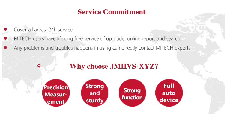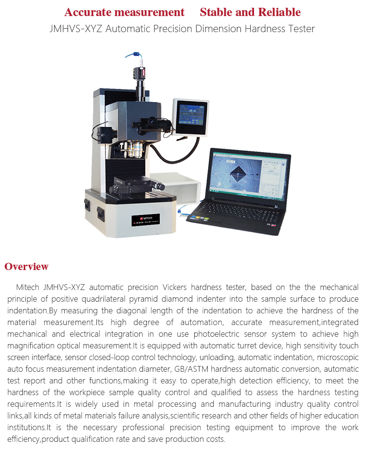Mitech JMHVS-XYZ automatic precision Vickers hardness tester, based on the the mechanical principle of positive quadrilateral pyramid diamond indenter into the sample surface to produce indentation.By measuring the diagonal length of the indentation to achieve the hardness of the material measurement.Its high degree of automation, accurate measurement,integrated mechanical and electrical integration in one use photoelectric sensor system to achieve high magnification optical measurement.It is equipped with automatic turret device, high sensitivity touch screen interface, sensor closed-loop control technology, unloading, automatic indentation, microscopic auto focus measurement indentation diameter, GB/ASTM hardness automatic conversion, automatic test report and other functions,making it easy to operate,high detection efficiency, to meet the hardness of the workpiece sample quality control and qualified to assess the hardness testing requirements.It is widely used in metal processing and manufacturing industry quality control links,all kinds of metal materials failure analysis,scientific research and other fields of higher education institutions.It is the necessary professional precision testing equipment to improve the work efficiency,product qualification rate and save production costs.