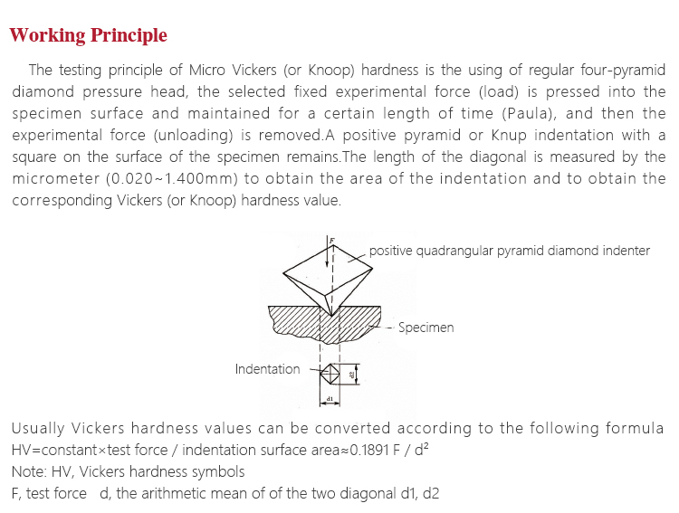 The testing principle of Micro Vickers (or Knoop) hardness is the using of regular four-pyramid diamond pressure head, the selected fixed experimental force (load) is pressed into the specimen surface and maintained for a certain length of time (Paula), and then the experimental force (unloading) is removed.A positive pyramid or Knup indentation with a square on the surface of the specimen remains.The length of the diagonal is measured by the micrometer (0.020~1.400mm) to obtain the area of the indentation and to obtain the corresponding Vickers (or Knoop) hardness value.