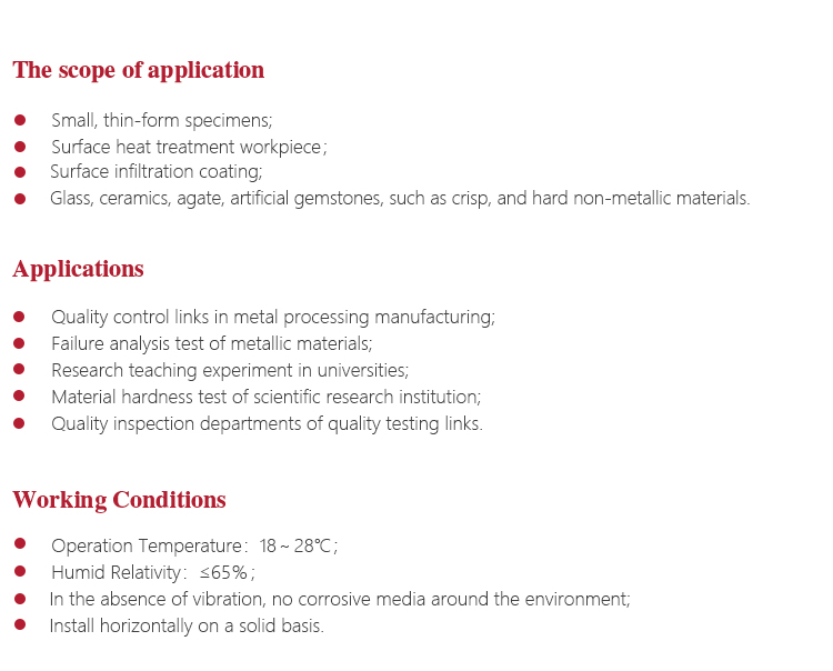 It is widely applied to the Vickers hardness test of the surface (infiltration coating) of the specimen such as micro specimen, thin specimen and heat-treatment workpiece, which can meet the needs of research institutions, precision processing manufacturing and quality inspection departments, and microhardness testing;