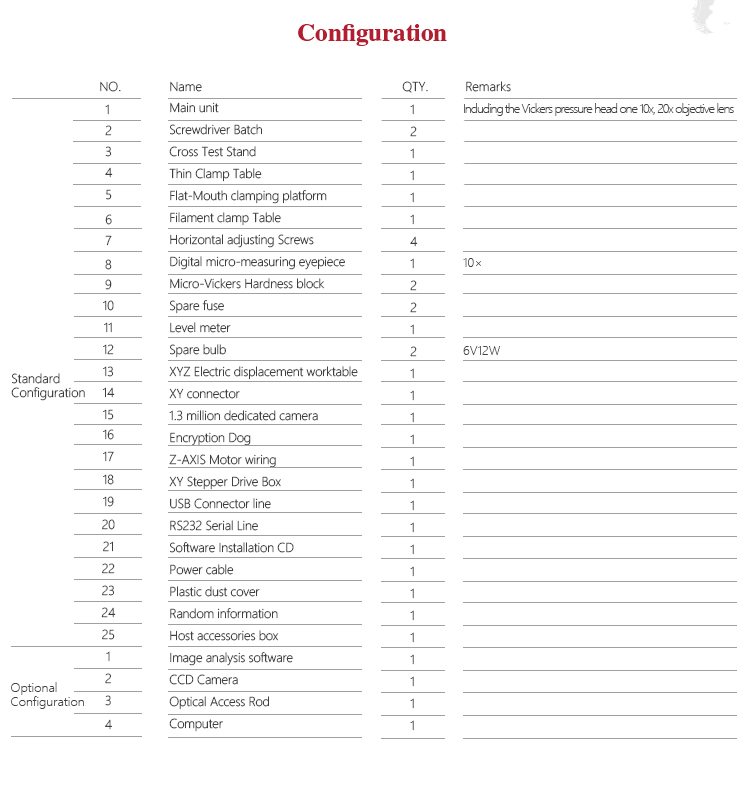 • Test force 1.96N(0.2Kgf)、4.9N(0.5Kgf)、9.8N(1Kgf)、19.6N(2Kgf)、29.4N(3Kgf)、49N(5Kgf)、98N(10kgf)、196N(20Kgf)、294N(
