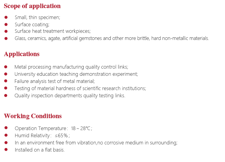 Working PrincipleMicro-Vickers (or Knoop) hardness test principle is that put the provisions of the positive pyramid diamond indenter into the sample surface(with fixed experimental force) and maintain a certain length (holding), and then unloading. Finally, there is a positive quadrangular pyramid or kenup indentation with a square surface on the surface of the specimen. Then we can attain the area of indentation via measuring the length of the diagonal by a micrometer eyepiece. Then the corresponding Vickers (or Knoop) hardness values are obtained.