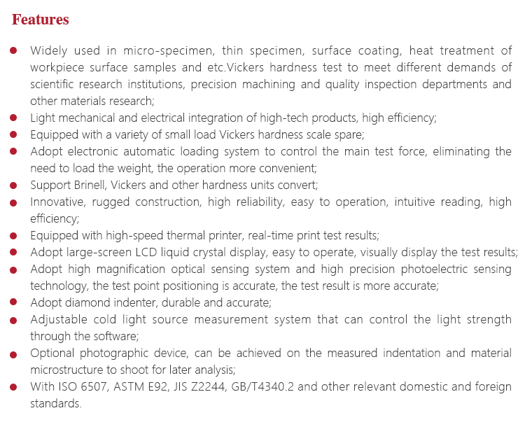 Instrument FeaturesWidely used in micro-specimen, thin specimen, surface coating, heat treatment of workpiece surface samples and etc.Vickers hardness test to meet different demands of scientific research institutions, precision machining and quality inspection departments and other materials research;