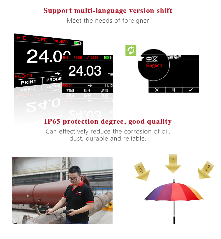 Instrument FeaturesMulti-mode: Pulse-Echo mode (P-E mode) and Echo-Echo mode (E-E mode). In Echo-Echo mode, it can test the wall thickness eliminating paint or coating thickness.