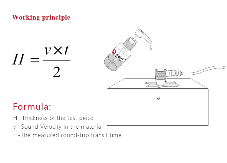The digital ultrasonic thickness gauge determines the thickness of a part or structure by accurately measuring the time required for a short ultrasonic pulse generated by a transducer to travel through the thickness of the material, reflect from the back or inside surface, and be returned to the transducer. The measured two-way transit time is divided by two to account for the down-and-back travel path, and then multiplied by the velocity of sound in the material. The result is expressed in the well-known relationship: H=v×t/2