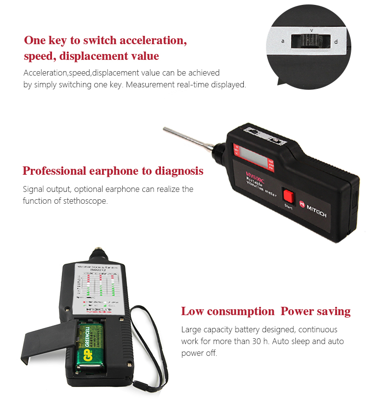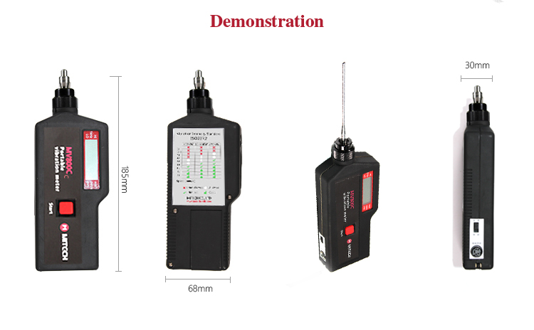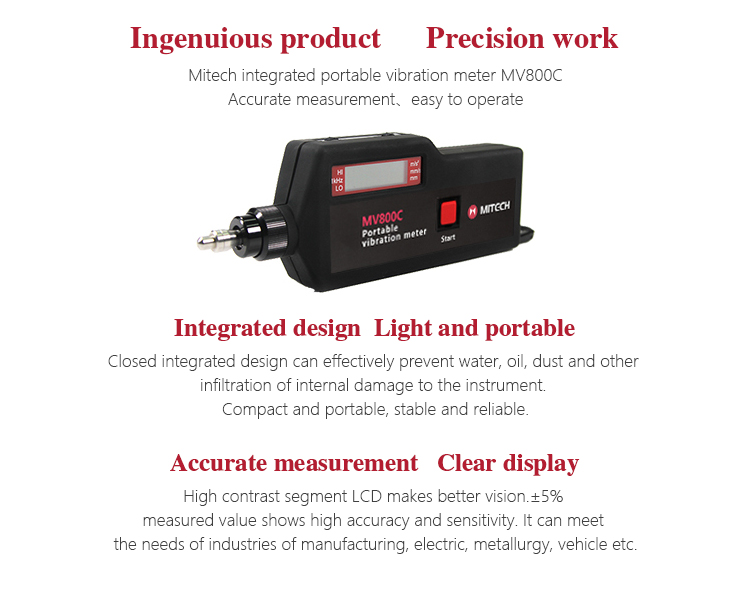 Product OverviewMITECH portable vibration meter MV800C is made up of piezoelectric transducer and digital display circuit. It is mainly used to measure vibration acceleration, speed and displacement of various rotary machine. This product has the advantages of large measurement, wide variety, intuitively demonstration, small size, light weight etc. It is widely used in measurement on site or at height and can reduce the working strength, improve the working efficiency.